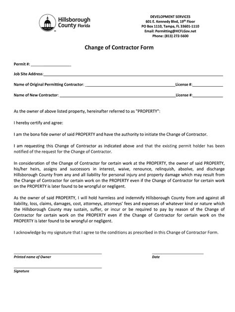 Change Of Contractor Form. Change of contractor(s) on an issued permit(s) is requested by the owner of record or the contractor for the permit and is accomplished in accordance to the florida building code (fbc) section 105.3.4. Web get free smartsheet templates.